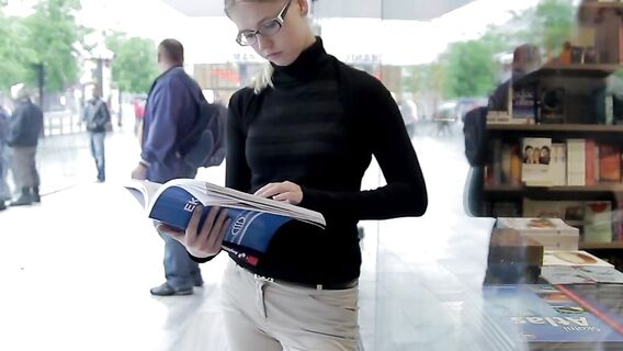 Блондинка в очках для зрения приобрела новую книгу и теперь внимательно изучала ее. Парень вызвался ей помочь, так как понимал, что с этой занудой блондинкой может быть и не так скучно, окажись они в другой обстановке. Он пригласил телку к себе, якобы, чтобы вместе изучить эту интереснейшую книгу, а на самом деле он просто хотел замутить секс с новой знакомой. Оказавшись в домашней обстановке, два очкарика слились в поцелуе, а потом принялись одаривать друг друга нежными ласками. Самец сделал ей куни, а она в ответ ему минет. Парочка жарко трахалась в разных позах на кровати, кайфуя друг от друга. Довольный самец кончил, облив ее очки спермой.